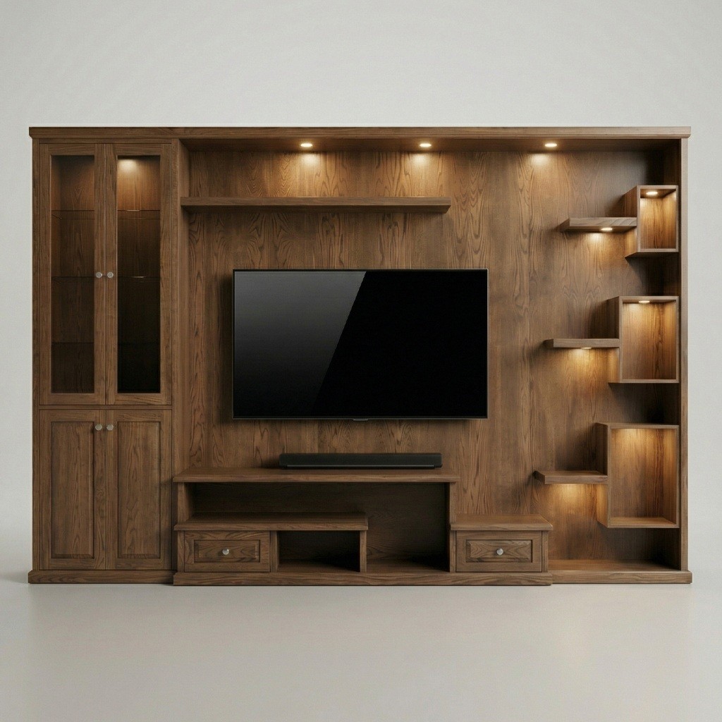 A built-in American Oak media wall with a TV recess, soundbar shelf, glass display cabinet, and asymmetrical illuminated niches. Framed by a slim shadowline, it reads warm and architectural while keeping cables and ventilation discreet.