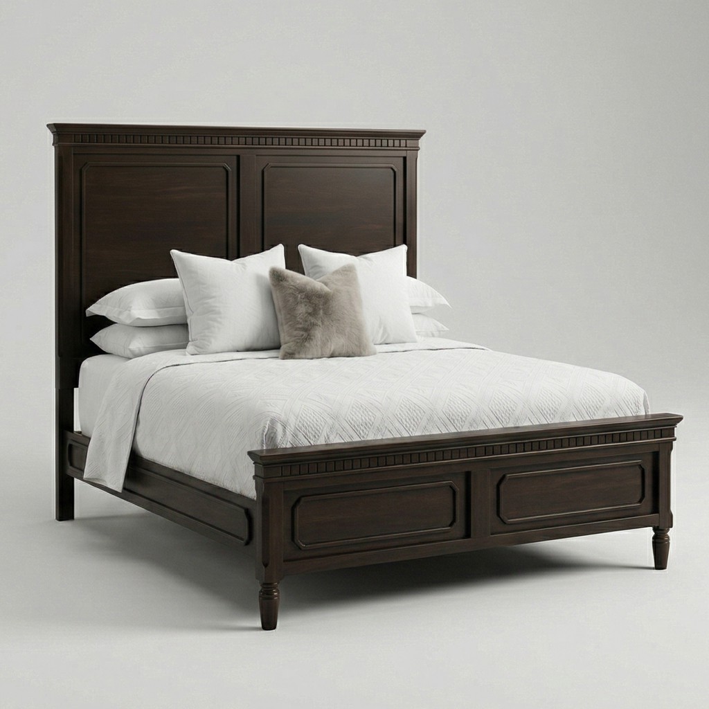 A stately timber bed with paneled headboard and footboard, dentil moulding, and turned feet. The deep espresso finish and crisp profiling give it a tailored, heritage look suited to classic or transitional interiors.