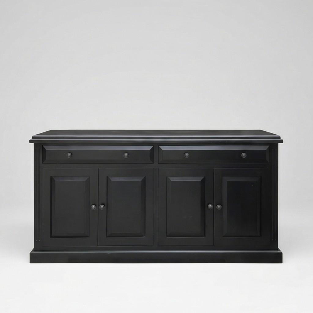 A classic, formal sideboard with framed drawers, panelled doors, and a solid plinth base. The ebonised Tasmanian Oak finish and moulded top give a timeless, tailored presence for dining rooms or entry halls.